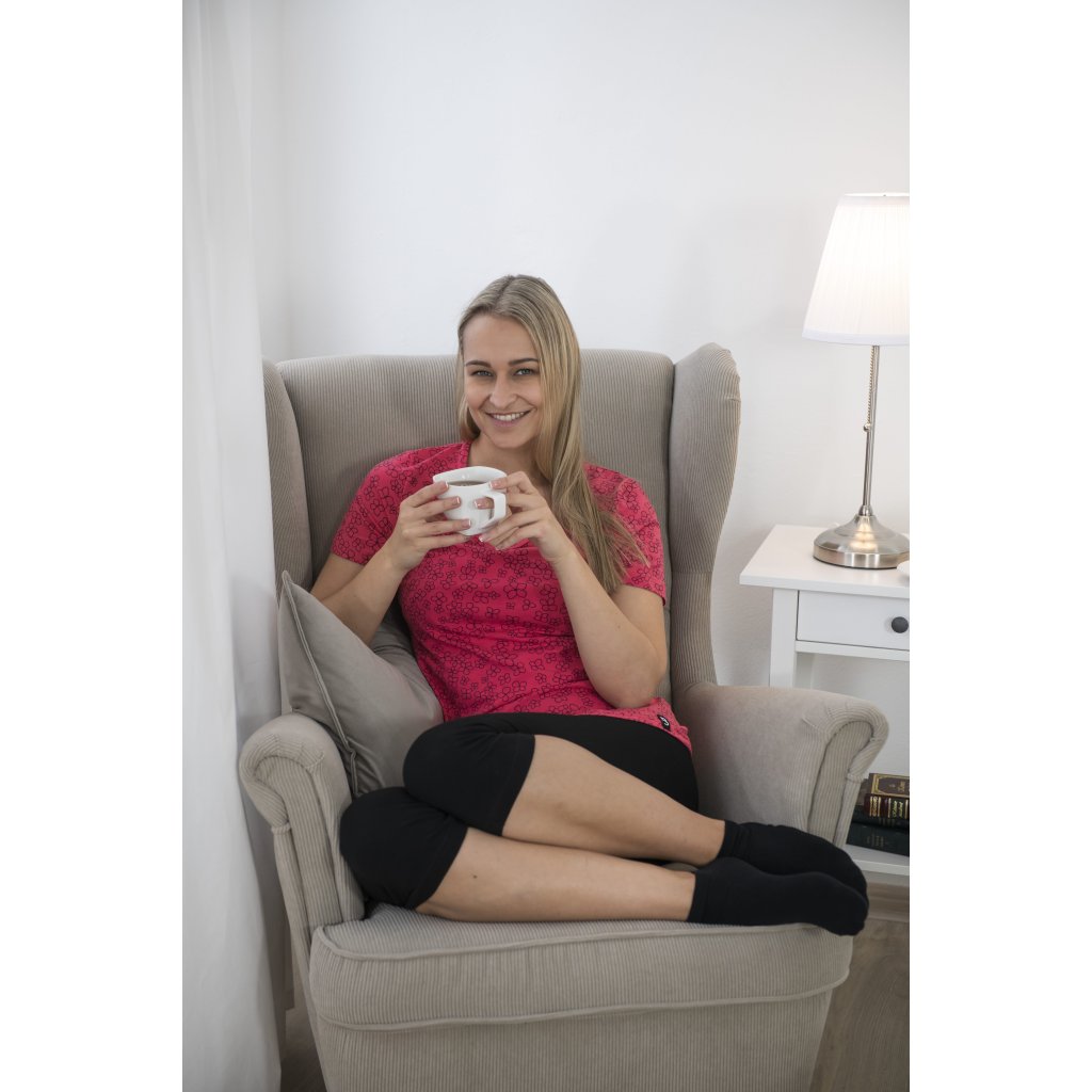Die Damen Capri-Leggings Outlast® aus Baumwolle, Elastan und dem wärmeregulierenden Outlast®-Material. Die Einzigartigkeit dieses Materials besteht nicht in der schnellen Ableitung des Schweißes vom Körper, sondern direkt in der Reduzierung der Schweißbildung. Dies ergibt sich aus der Tatsache, dass Outlast®-Material die Temperatur zwischen Haut und Wäsche konstant hält. Deshalb nimmt Outlast®, wenn Sie sich erwärmen, ob nun durch schnelle Bewegung oder durch erhöhte Umgebungstemperatur, die Wärme auf, bevor die Haut zu schwitzen beginnt. Bei Abkühlung gibt Outlast® umgekehrt an Ihren Körper Wärme ab. Die 3/4 Leggings sind elastisch, weich und sehr angenehm zu berühren. Dieses dünne Material ist auch für die problematische Haut geeignet (Allergiker, Kinder mit atopischem Ekzem). Das Material ist sehr dehnbar und angenehm auf der Haut. Darüber hinaus bietet es einen UV-Schutzfaktor von UPF 50+.