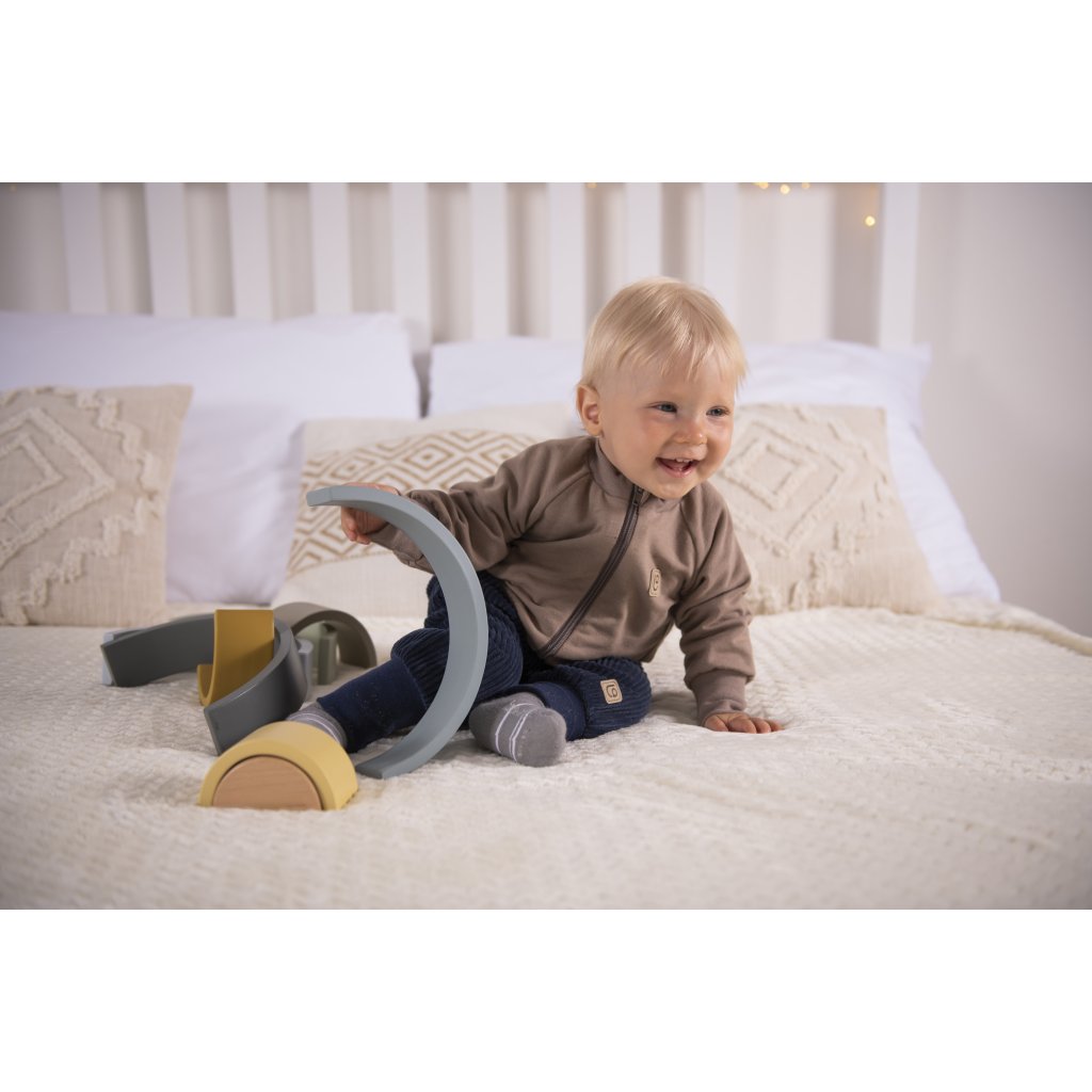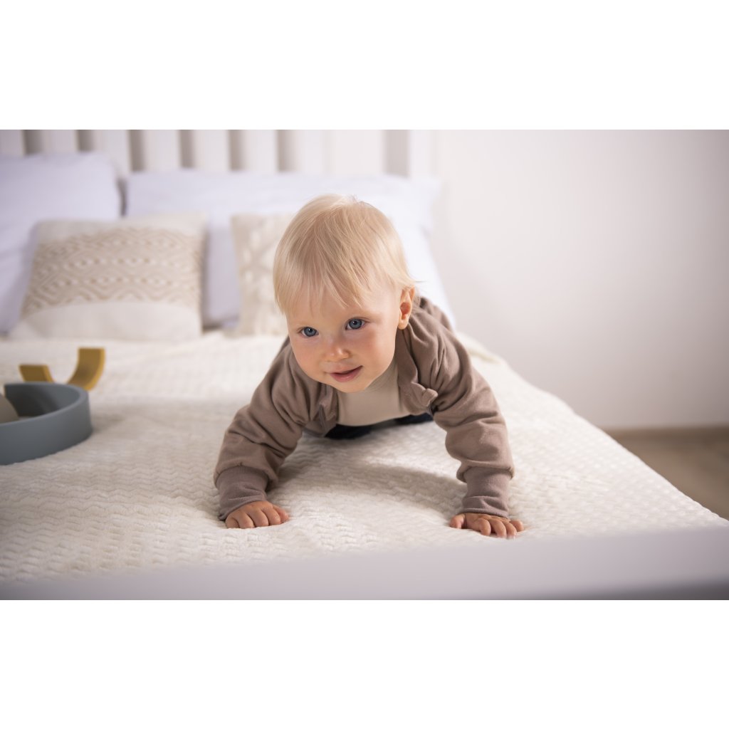 Für die Herstellung wurde das thermoregulierende Outlast®-Material in einer Schlingenvariante verwendet: glatt auf der Vorderseite, mit weichen Schlingen auf der Rückseite. Dank seiner innovativen Eigenschaften sorgt Outlast® für optimalen thermischen Komfort in jeder Situation. Das Material reagiert intelligent auf die Körpertemperatur des Kindes: Bei Überhitzung nimmt es überschüssige Wärme auf und reduziert das Schwitzen. Sinkt die Körpertemperatur, gibt Outlast® die gespeicherte Wärme wieder ab und wärmt den Körper. So kann sich Ihr Kind unbeschwert allen Aktivitäten widmen – ohne zu frieren oder ins Schwitzen zu geraten.