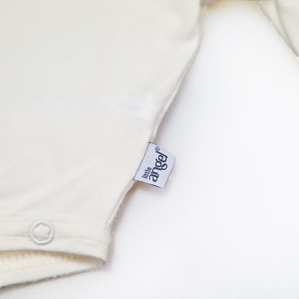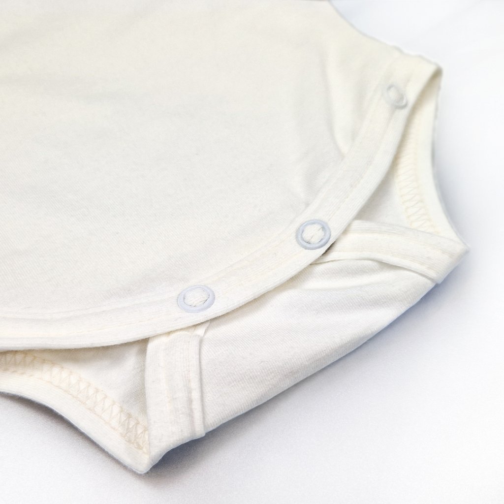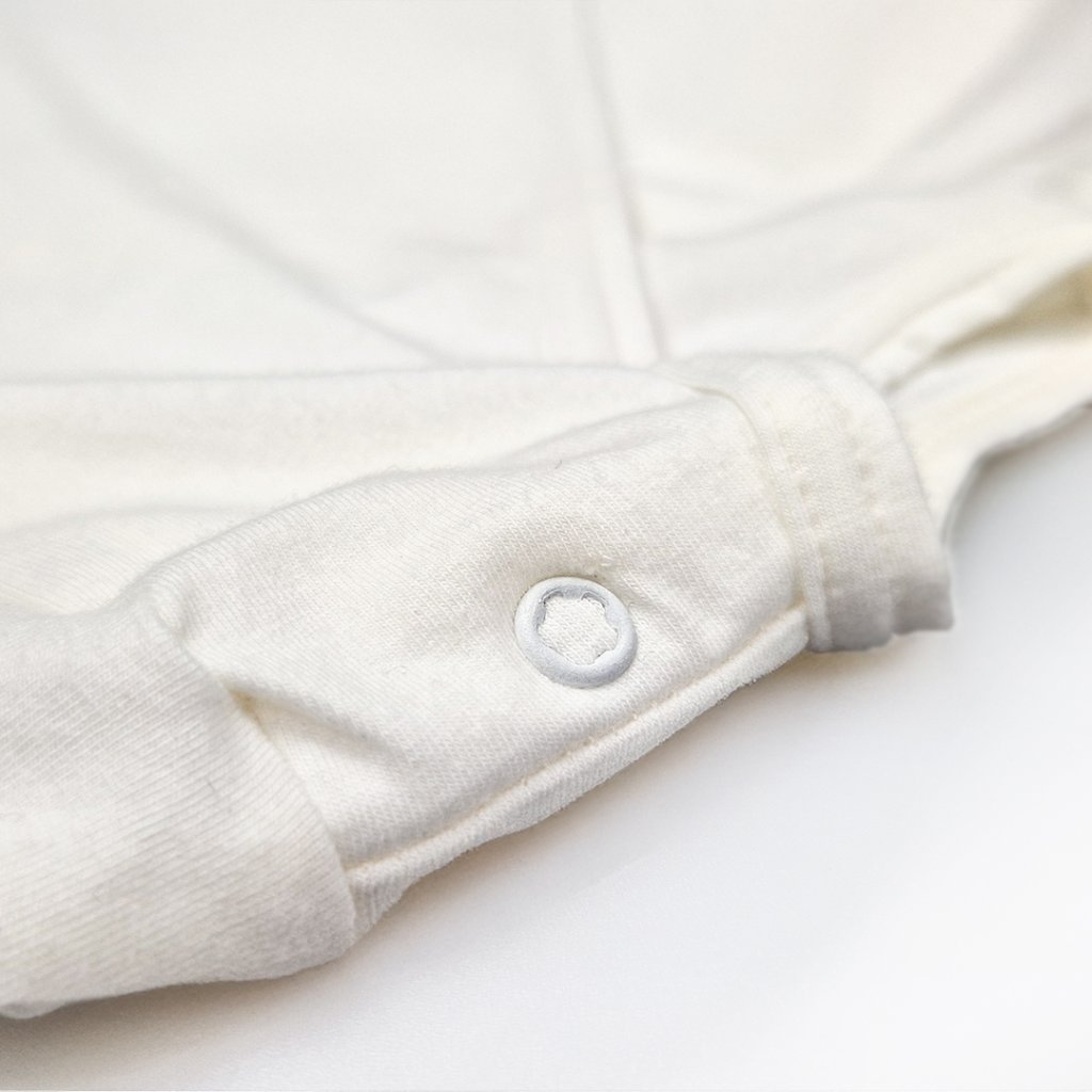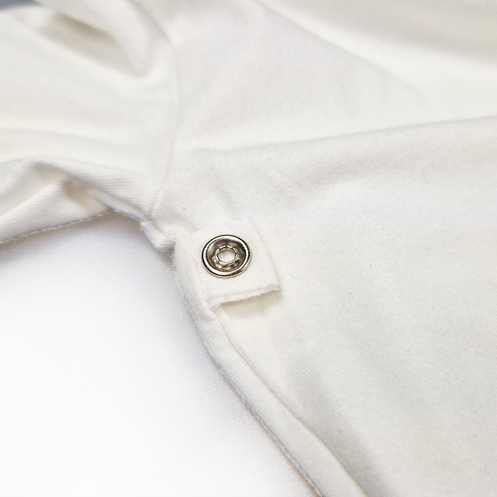 Der Druckknopf-Verschluss – auf den Schultern, im Schritt und an der Seite erleichtert möglichst viel das Anziehen und Wickeln des Neugeborenen.Schön und zugleich funktionell.